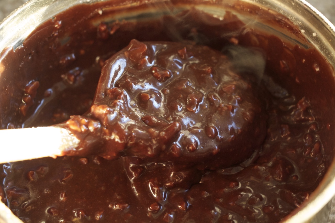 Pirmā kārta gatava cepšanai – šokolādes mīklas faktūra, tekstūra un smarža ir kārdinošas.