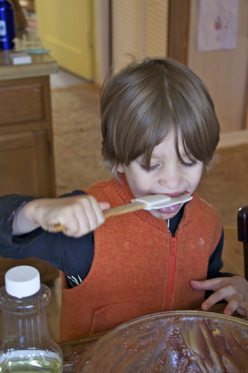 Tad ar elektrisko mikseri sakuļ trīs olas (vidējā ātrumā – teikts receptē, bet manam putotājam ātrumi neregulējas, tāpēc visām procesa daļām bija viens ātrums), kamēr tās ir viegli putainas. Palielinot ātrumu, pakāpeniski pievieno cukuru, un “sit” (tā teica mana vecmāmiņa), kamēr olu un cukura maisījums ir pavisam gaišs un palielinājies apjomā divas reizes. Tas paņem apmēram 7-8 minūtes. Pēc tam atkal jāatgriežas vidējā miksera ātrumā un pakāpeniski jāpievieno eļļa, un atkal “jāsit”, kamēr emulgējas un atgādina nedaudz graudainu majonēzi. Tad ar pašu mazāko ātrumu pakāpeniski maisa klāt sauso daļu un paniņas – miltu maisījums, paniņas, miltu maisījums, paniņas, miltu maisījums. Maisa, kamēr viss labi sajaucies. Beigās ātri iemaisa etiķi un vaniļu. Jācep apmēram 50 minūtes – kamēr ir redzams, ka malas viegli atdalās no cepampapīra un sērkociņš iznāk ārā sauss. Atdzesē.