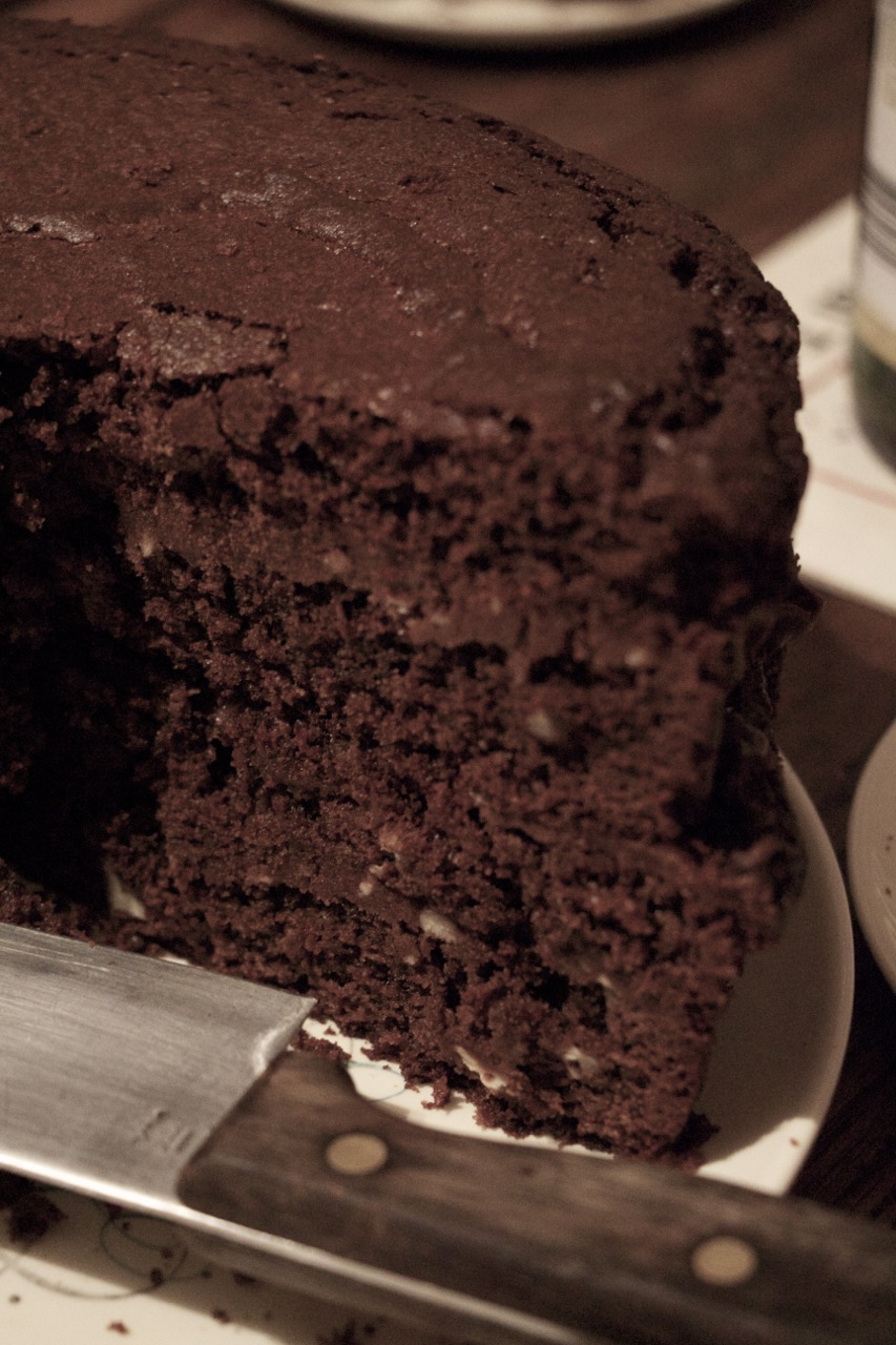 Un kāpēc es nebūšu foodblogere? Pirmkārt, tas ir traki sarežģīti, es tagad apbrīnoju visus, kuri raksta par ēdieniem, gatavo un vēl smuki nobildē!! Taisīt un maisīt un mēģināt vēl nofotogrāfēt, turklāt fotogrāfēt ēdienu, tā lai tas izskatītos garšīgs, nevis prasts, ir grūti. Un tā kā es iemanījos fotaparātā arī iesmērēt nedaudz mīklas, Jānis teica, ka man vispār nevar atļaut nekādu foodblogošanu. Otrkārt, pārtikas aprakstnieki parasti raksta par to, kas viņiem pašiem patīk un garšo, bet šo kūku es droši vien vairāk necepšu. Tā ir briesmīgi trekna (tie eļļas daudzumi!) un salda (5 tases pūdercukura!), un es tiešām nevarēju apēst vairāk par vienu gabaliņu, kas man parasti nav problēma. Taču vīriešiem patika, un tiem, kas ir kāri uz šokolādīgumu augstā pakāpē, noteikti par šo kūku kaifos. K uz savu vārda dienu arī sagaida šādu pašu. Ko nu?