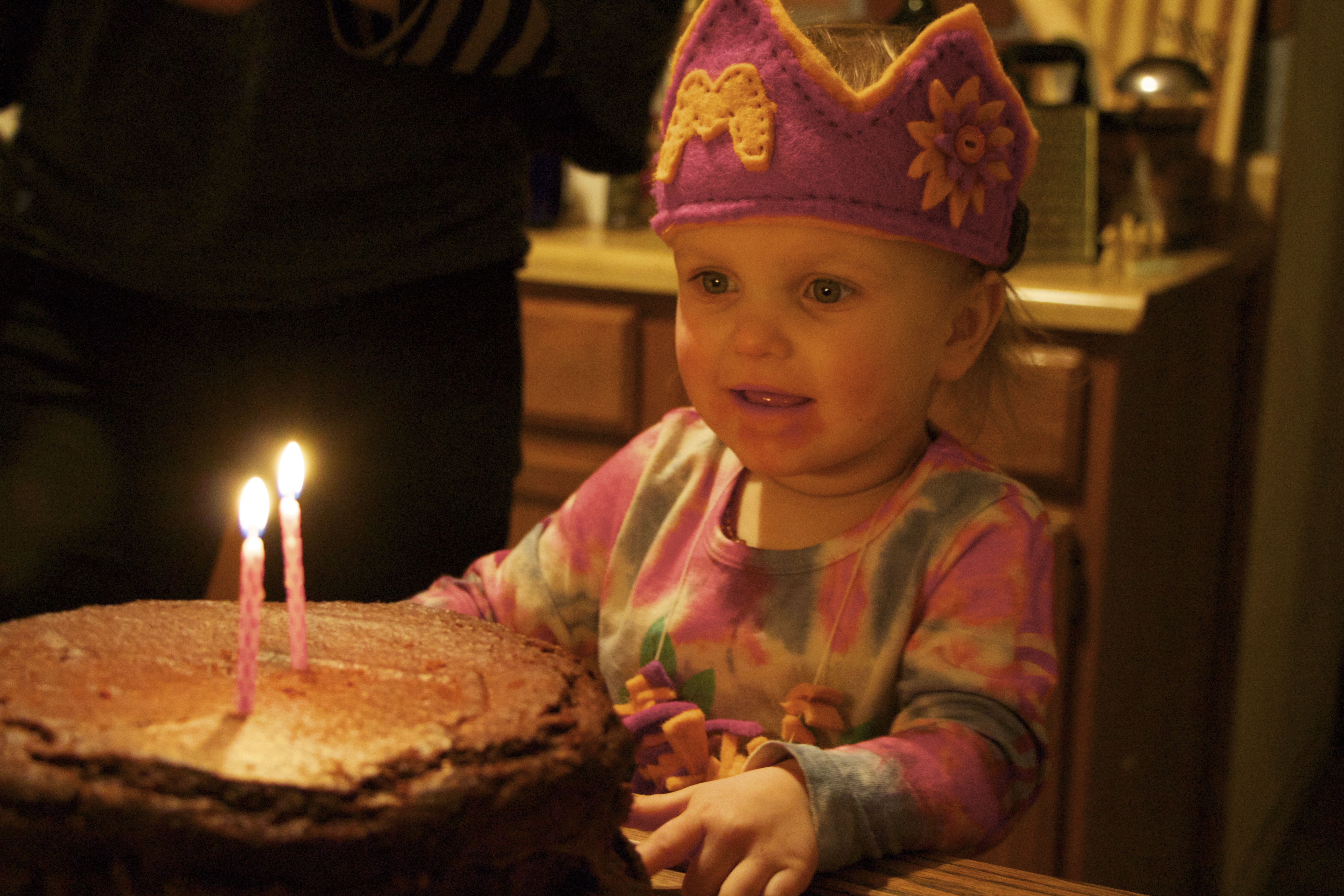 Milzīgā kūka, divas maziņas svecītes un jubilāre.