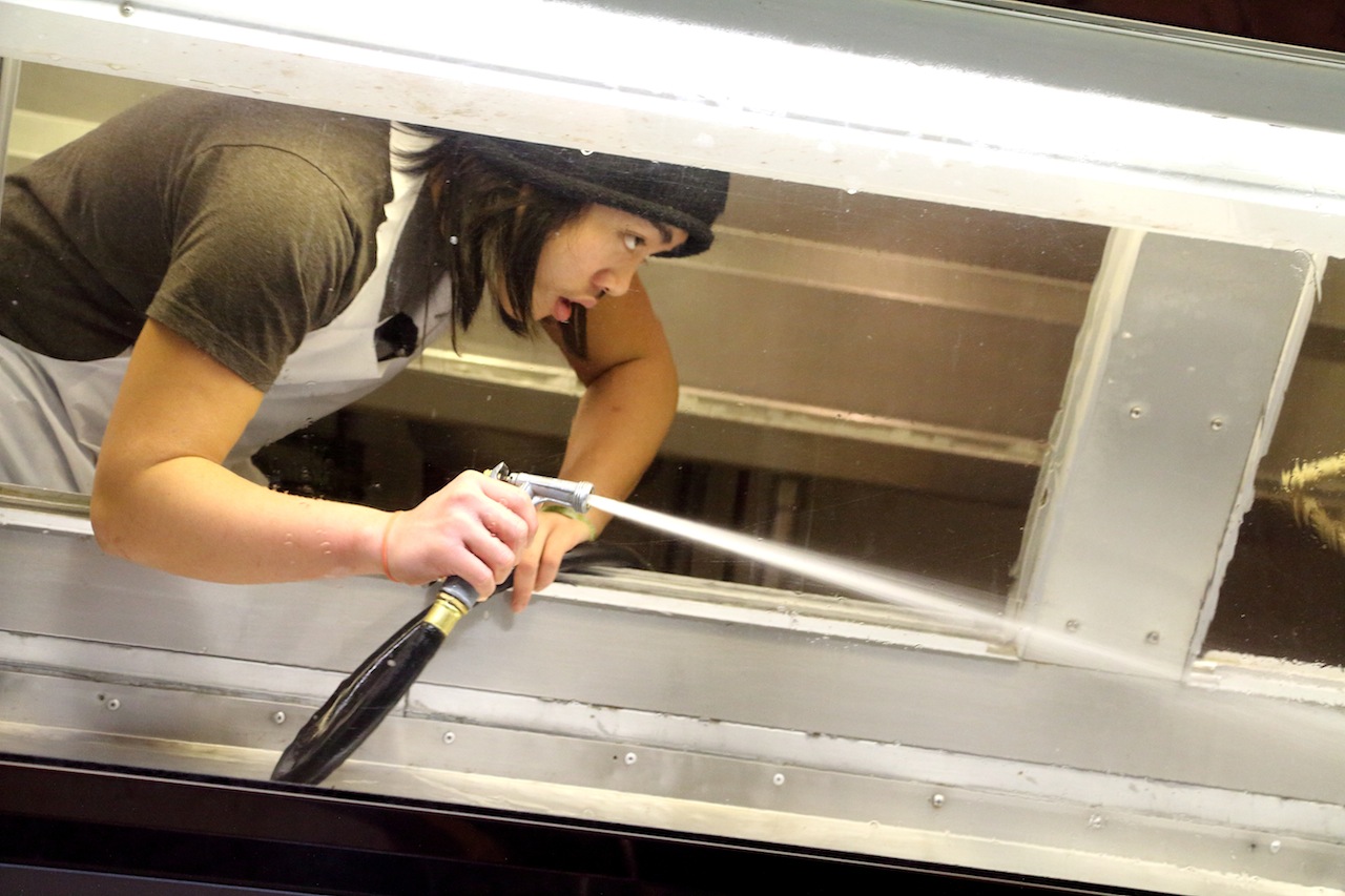 Tirgus darba laiks tuvojas beigām. Svaigo zivju pārdevējs mazgā vitrīnu.