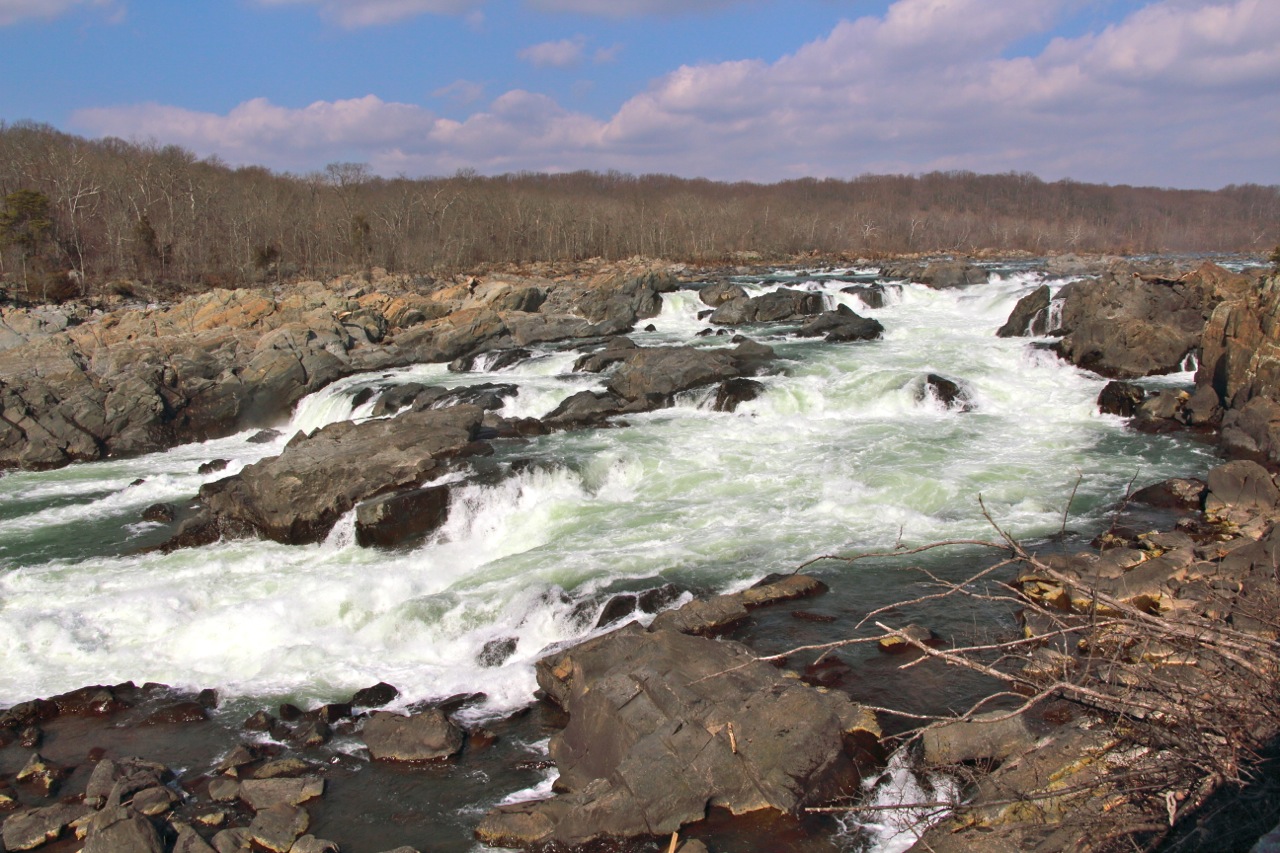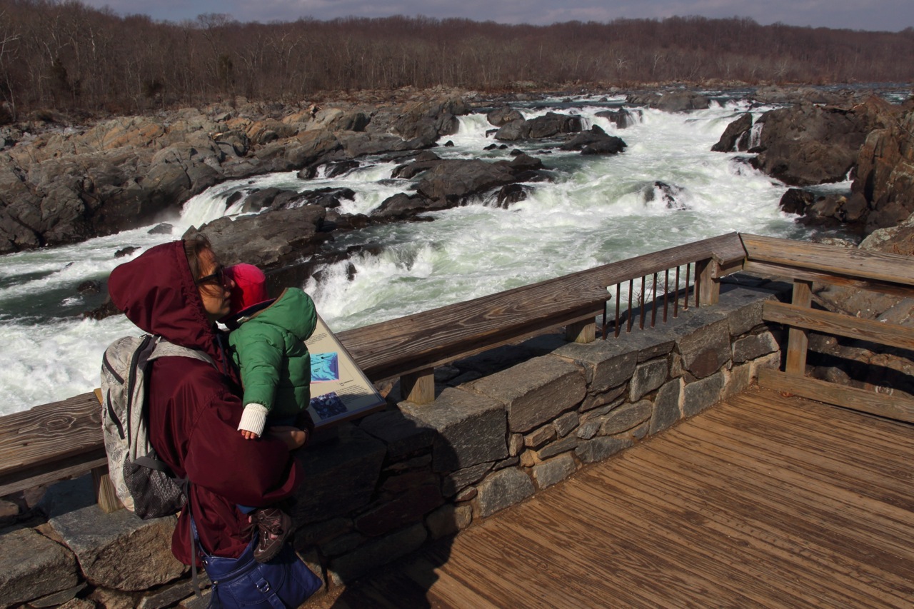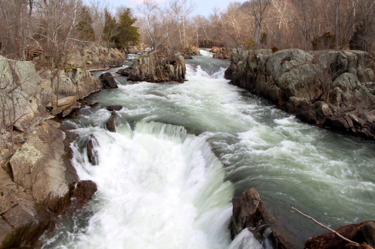 Lielā Potomakas upe vienmēr ir tepat līdzās – te pārbraucam pāri, te redzam kaut kur pazibam līdzās ceļam. Bet tā īsti iepazinušies vēl nebijām. Potomaka ir ceturtā garākā upe Amerikas Atlantijas krastā un 21. lielākā visā valstī. Tās nosaukums ir eiropiešu vienkāršojums tās krastā dzīvojošās indiāņu cilts vārdam, un tā tiek saukta arī par Nācijas upi, jo cieši saistīta ar Amerikas vēsturi un galvaspilsētu. Pusstundas brauciena attālumā no mūsu mājas ir Potomakas Lielo ūdenskritumu dabas parks – tas ir vietā, kur upe sašaurinās un kļūst klinšaina un krāčaina. Vienā Potomakas pusē ir Merilendas štats, otrā – Virdžīnijas. Turpat ir daudz takas, senais Džordža Vašingtona laikā būvētais kanāls, kurš bija paredzēts, lai veicinātu kuģošanu pa Potomaku un līdz ar to tirdzniecību, zelta raktuvju paliekas un daudz planējoši vanadziņi zilajās debesīs. Lai arī autostāvvieta pilna ar mašīnām, parka plašumā cilvēku daudzums izšķīst. Riteņbraucēji, skrējēji, staigātāji ar suņiem, staigātāji ar bērniem, daži kajakotāji.